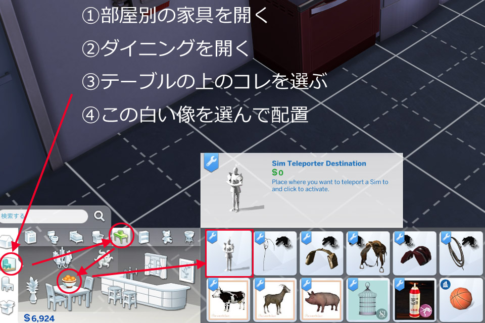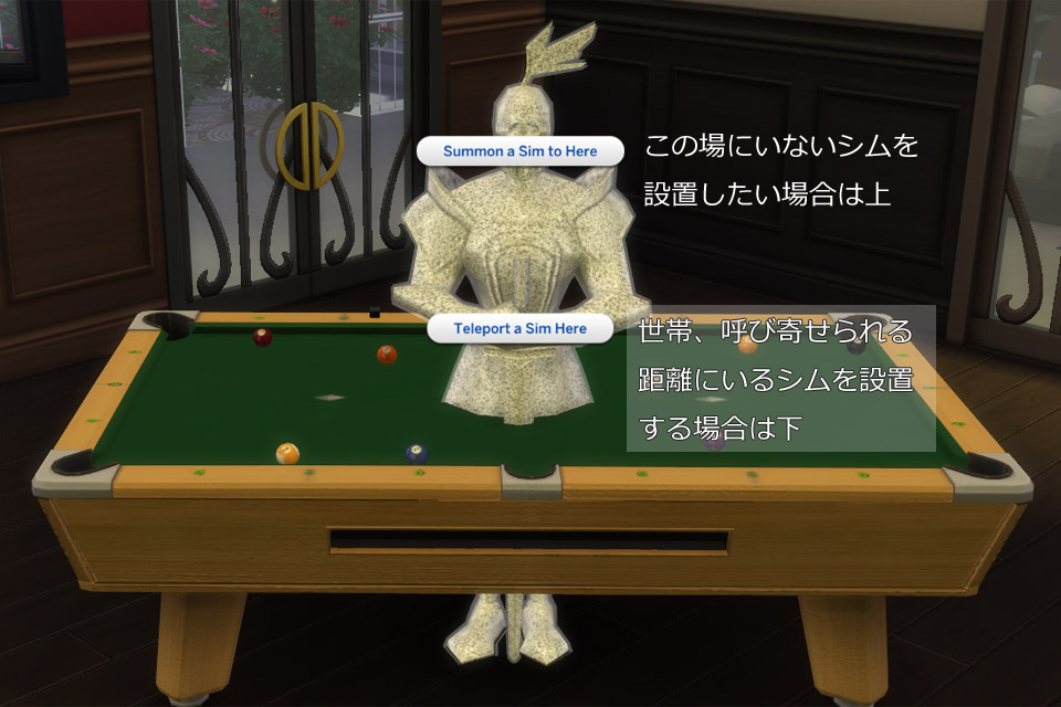 このテレポートを使うものは、カップル等複数人数や、家具、アイテムを使った撮影には欠かせません。一方で場所や人を選ばないポーズには不用ですし、ポーズプレイヤーさえあればポーズをテストで見たいときに適当な場所でその姿勢を取らせることは可能です。