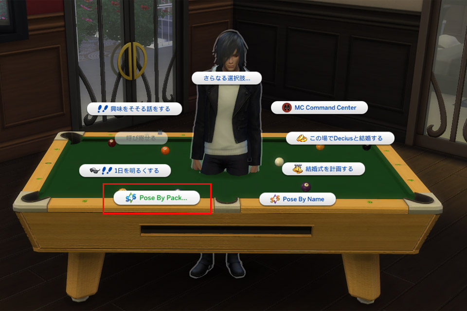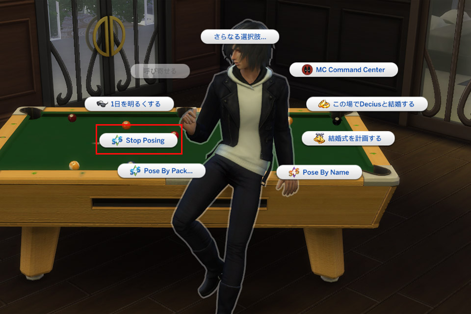 終了するときはStopPosingで。(あるいはシムの行動欄を×する)