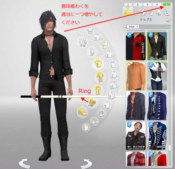 CAS画面で事前に持たせておく必要があります。普段着で持たせて撮影したいなーっていうときは、普段着を増やして持たせておくと便利です。今回のキューはリング枠にありますが、物や作者によってさまざまです。